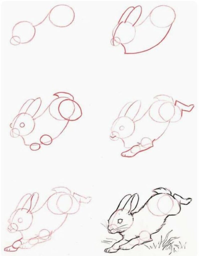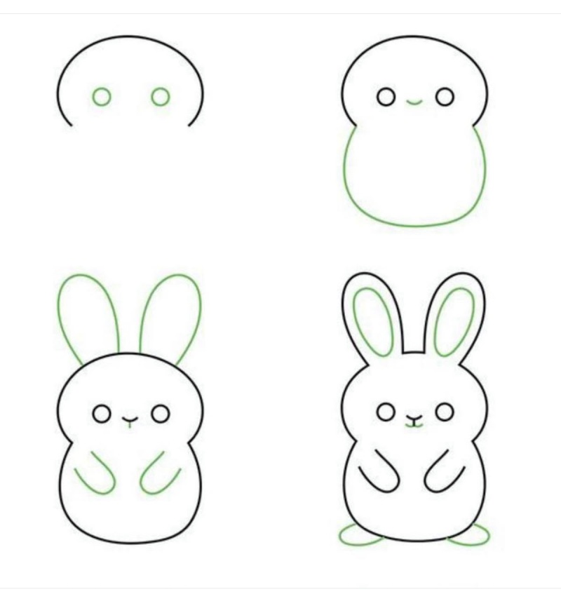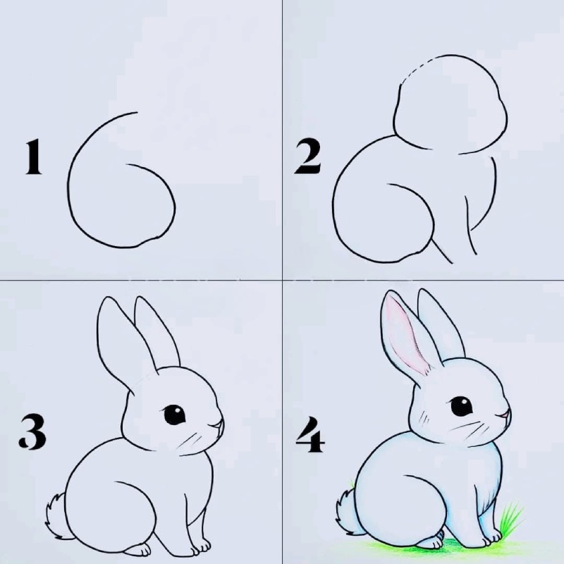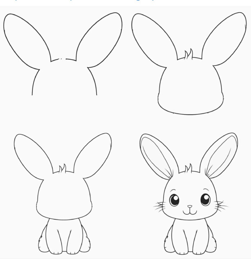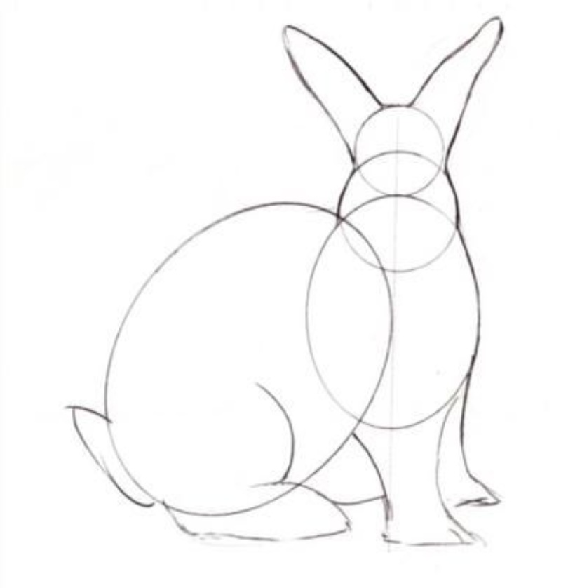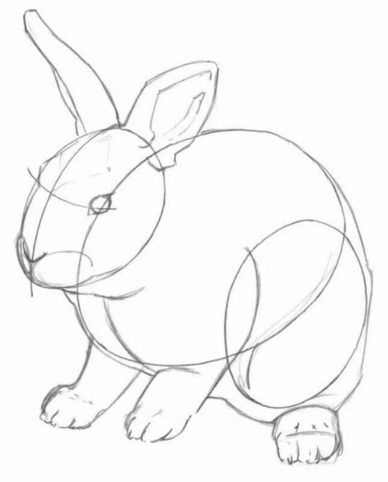 Спершу олівцем роблять коло для голови, потім додають довгі вушка. Далі з’являється тулуб – овальна форма, яка плавно переходить у лапки. Маленький круглий хвостик завершує основу малюнка.