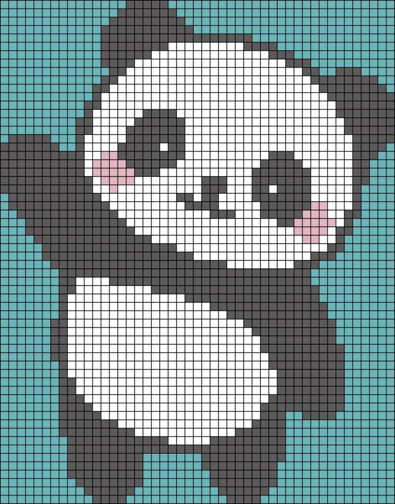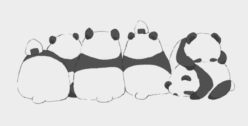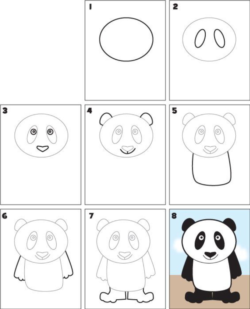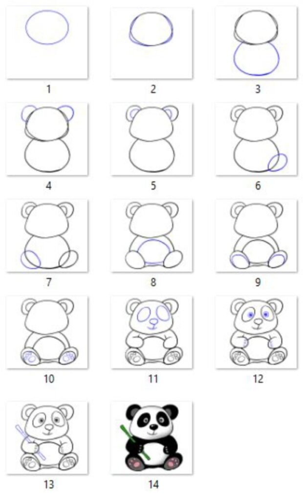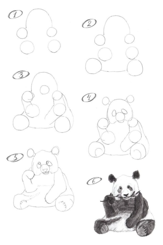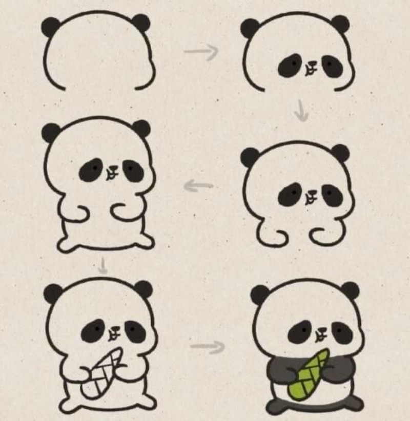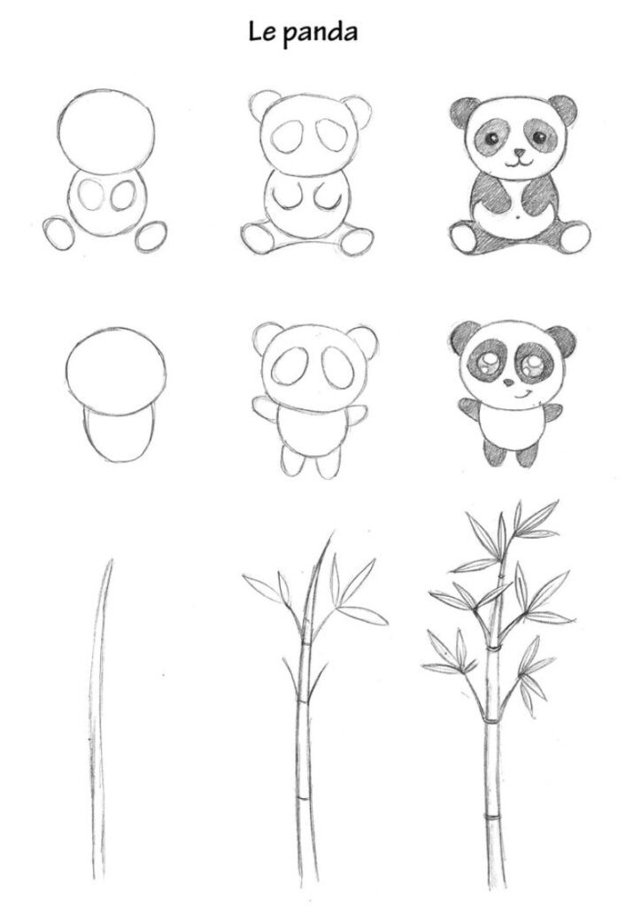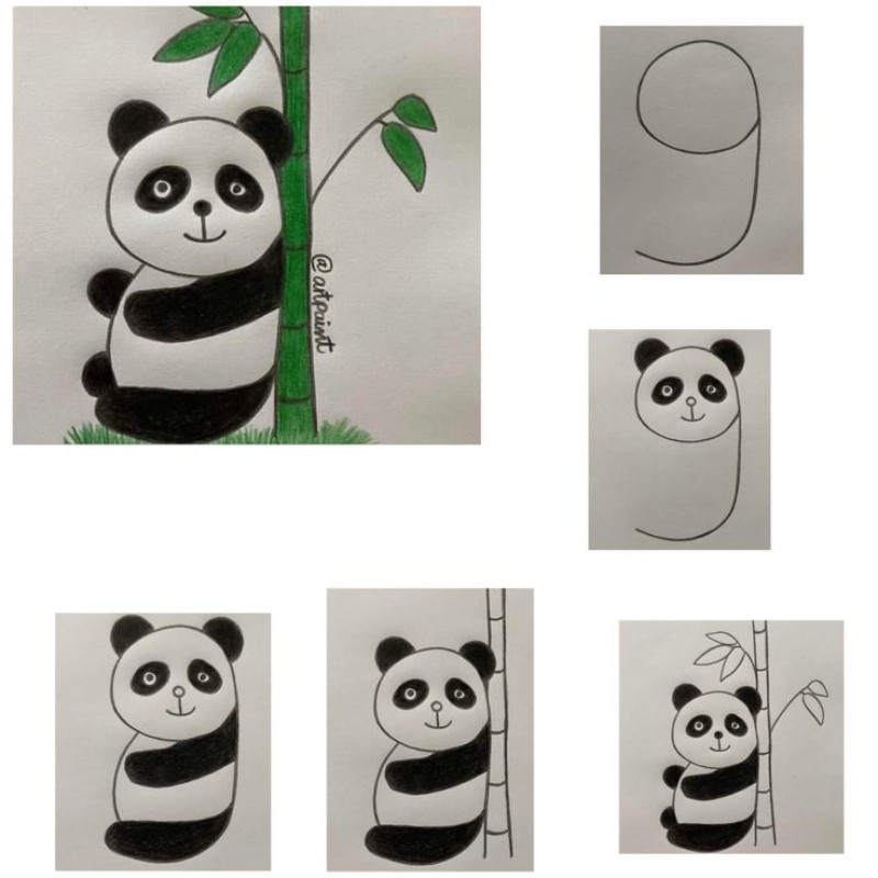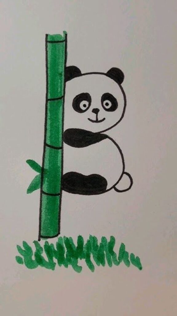 Панду можна зобразити в сидячій позі, тримаючи в лапках стебло бамбука з листочками. Виразні очі надають малюнку особливу миловидність. Контури обводяться темнішим кольором, після чого додається штрихування та забарвлення. Бамбук можна зробити яскравішим, виділивши текстуру та промальовуючи листя.