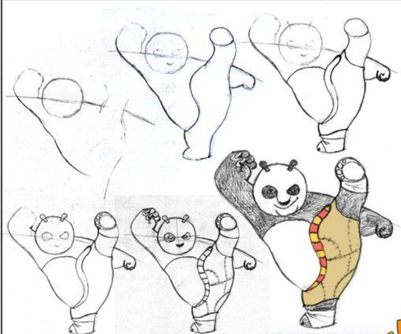 Зображення пандочки у динамічній позі передає рух і енергію бойового мистецтва. Основна увага приділяється виразній позі, деталям, таким як пов’язка на голові чи бойові рукавиці. Додаються м’язові обриси, що підкреслюють активність і силу. Тіні та контури допомагають створити глибину та зробити образ більш реалістичним.