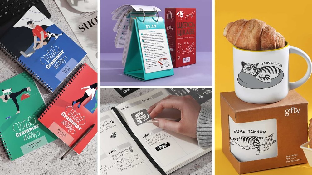 - освітній проєкт — блокноти з цитатами, сертифікати на курси каліграфії, сторітелінгу, календарі «Мандрівка Україною», «Щось цікаве» чи «10 points» для вивчення англійської мови;